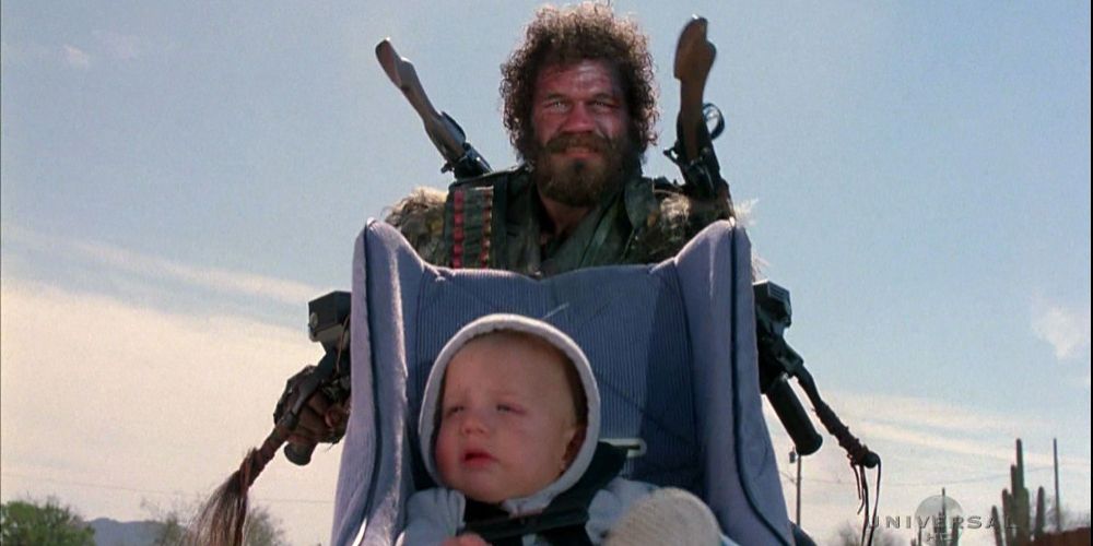 Played for heightened comedic effect, the burly post-apocalyptic biker Leonard Smalls (Randall "Tex" Cobb) in Raising Arizona is humorous and horrifying in equal measure. The biker bounty hunter offers his services to find Nathan Jr., the baby kidnapped by H.I. (Nicolas Cage).
